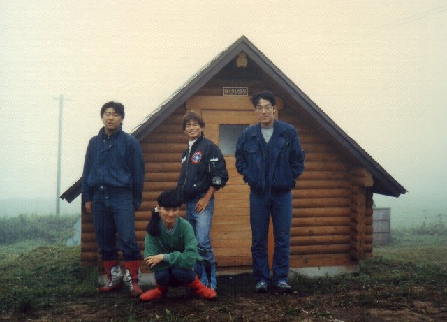 霧多布のキャンプ場、皆ここで知り合った人たちで、後ろのお兄さん3人と相部屋でこのバンガローを借りました。 400円だったかな、1泊ひとり100円です。 霧多布岬とは相性が悪いのか、いつも霧が掛かっていて、岬が見れたのはこの後何年か後のことでした。