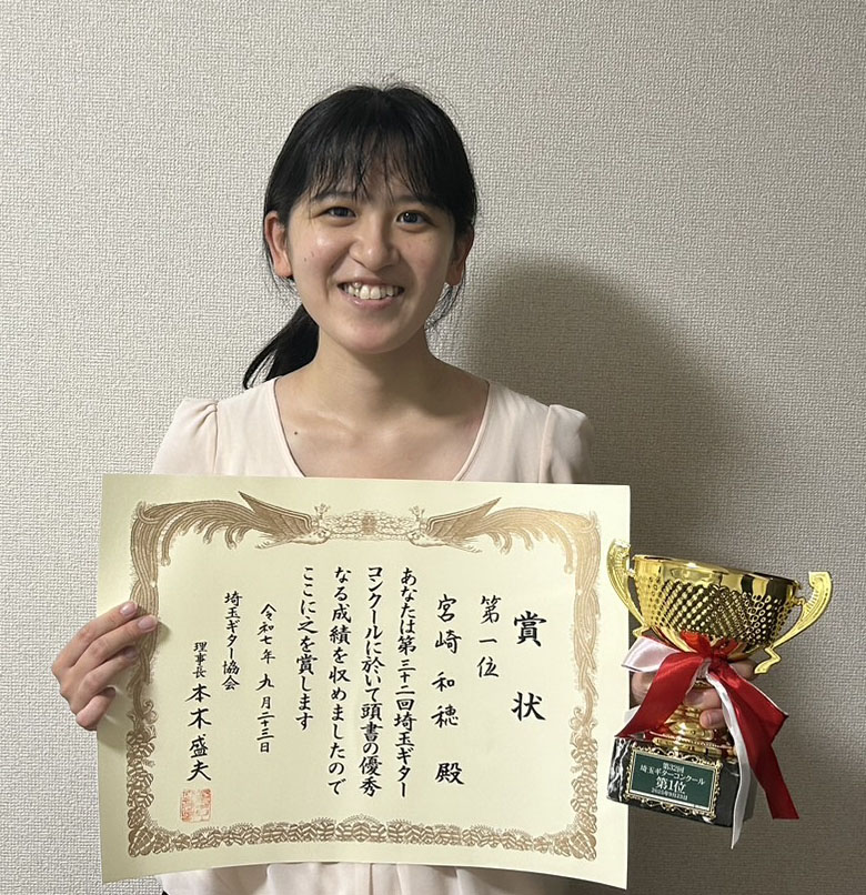ギター科の宮﨑和穂さんが2025/9/23日 開催された第32回埼玉ギターコンクール(全国から45人応募)で優勝しました。小学生の時、神奈川新人ギタリストオーディション首席入賞以来、久しぶりのコンクールチャレンジです。これからが楽しみです。