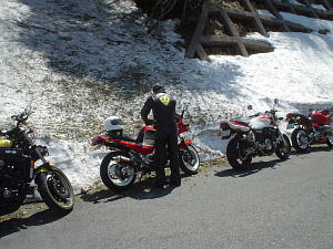 頂上辺りはまだまだ、雪がありタッキーのV-MAXの横は、なだれ跡?>なだれが始まりそう?>撮影後すばやくスタート。