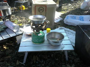 炭に火が入り、炭の火力と、アルコールパワーで寒さも飛ばしたつもりだったけれど、少しの時間だけ、横雨とタープからの雨水で、ちょっとしたハプニングもあり。