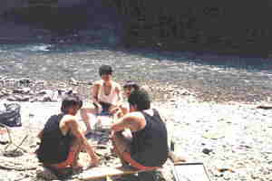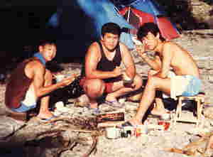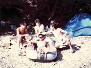 キャンプ場では、高級なテントやタープなど使用していますが、この時は、テントしかありません。遊び道具としては、ゴムボートだけで、一日中遊んでいました。食事は缶詰や飯ごうを使って、料理などをしました。
