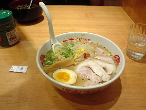 豚骨なのに、かなりあっさりなラーメンで、かき回すと濃厚なスープが出てきて、トッピングの高菜を入れると美味くなる。
